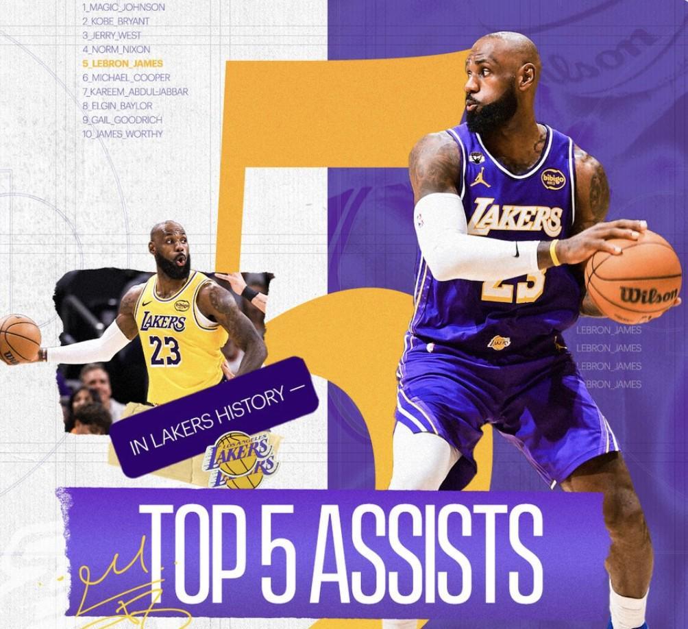 比赛进行到第二节,随着詹姆斯送出的一次助攻,他的湖人生涯助攻总数来到3667次,超越球队名宿迈克尔-库珀升至队史第五位。